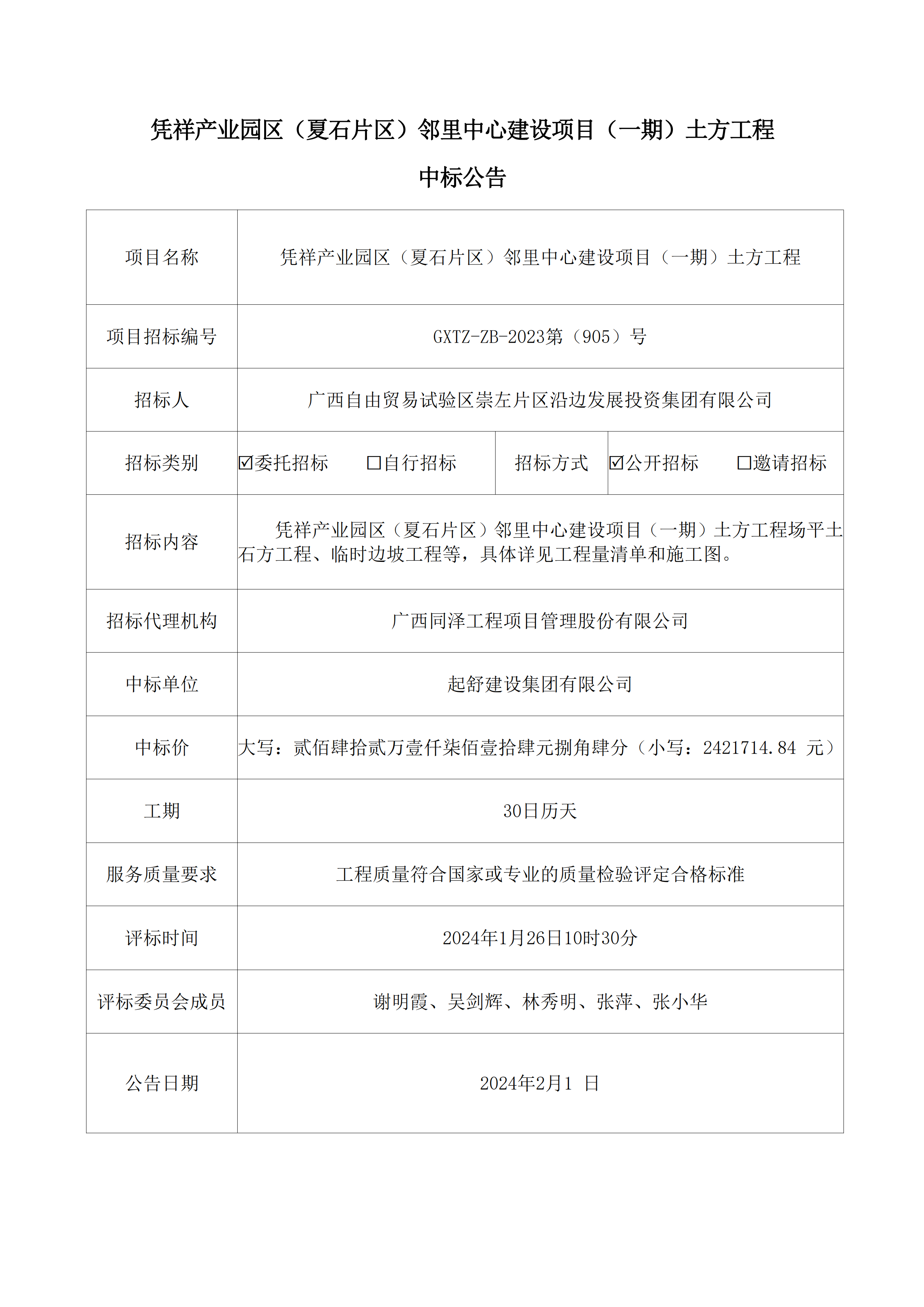 憑祥產(chǎn)業(yè)園區(qū)(夏石片區(qū))鄰里中心建設(shè)項(xiàng)目(一期)土方工程中標(biāo)公告